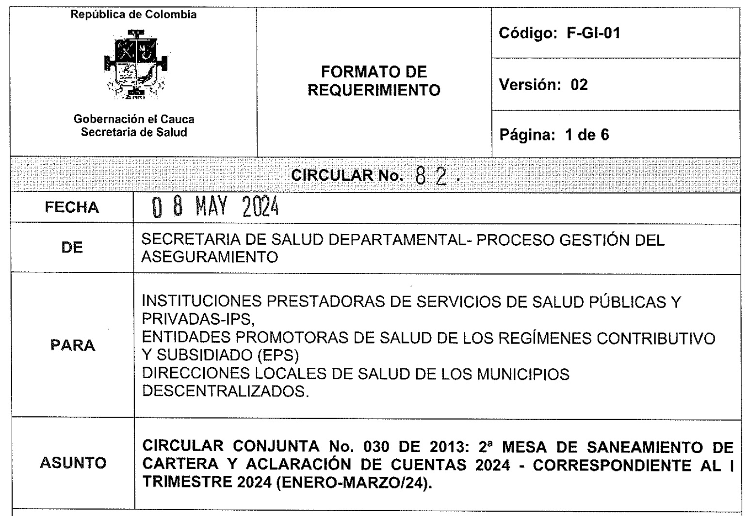 De: Secretaría Departamental de Salud del Cauca Para: Alcaldes municipales, Secretarios de salud municipales, Secretarios de gobierno municipales, Consejos municipales de gestión del riesgo, autoridades de pol...